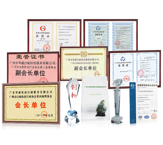 是廣州市白蟻防治行業協會會長單位,《全國白蟻防治服務3AAA級單位》,《全國白蟻防治十佳單位》,連續十年榮獲《守合同、重信用企業》,廣州鼠害與衛生蟲害防制協會會員單位,本公司已通過ISO:9001質量管理體系認證、ISO:14001環境管理體系認證、OHSAS18001職業健康安全管理體系認證。公司擁有一批經驗豐富的白蟻研究專家和白蟻防治工程技術人員。